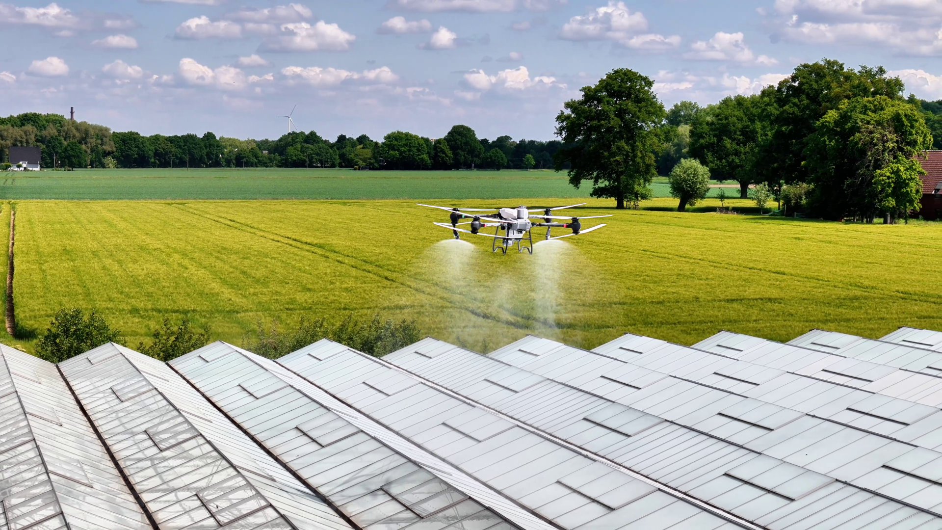 Wenn im Sommer die Sonne scheint, heizen sich Gewächshäuser schnell auf – das kann zu Hitzeschäden und Verbrennungen an Pflanzen führen. Viele Betriebe nutzen daher bewegliche Schattierungsgewebe, welche im Innenbereich des Gewächshauses angebracht sind. Diese halten die Hitze jedoch nicht davon ab, ins Gewächshaus einzudringen. Aus diesem Grund ist häufig eine zusätzliche Schattierung mit Farbe auf dem Dach nötig. Früher mussten diese Arbeiten von Hand erledigt werden: zeitaufwendig, körperlich belastend und sehr gefährlich – schließlich sind Gewächshäuser mittlerweile oft sechs bis sieben Meter hoch und aus Glas. Heute übernimmt die Drohne diese Aufgabe sicherer und deutlich gleichmäßiger. „So präzise wie eine Drohne kann kein Mensch schattieren. Sie fliegt in konstanter Höhe und Geschwindigkeit und vernebelt die Farbe optimal – bei windstillen Bedingungen ist das Ergebnis perfekt“, erklärt Sebastian.