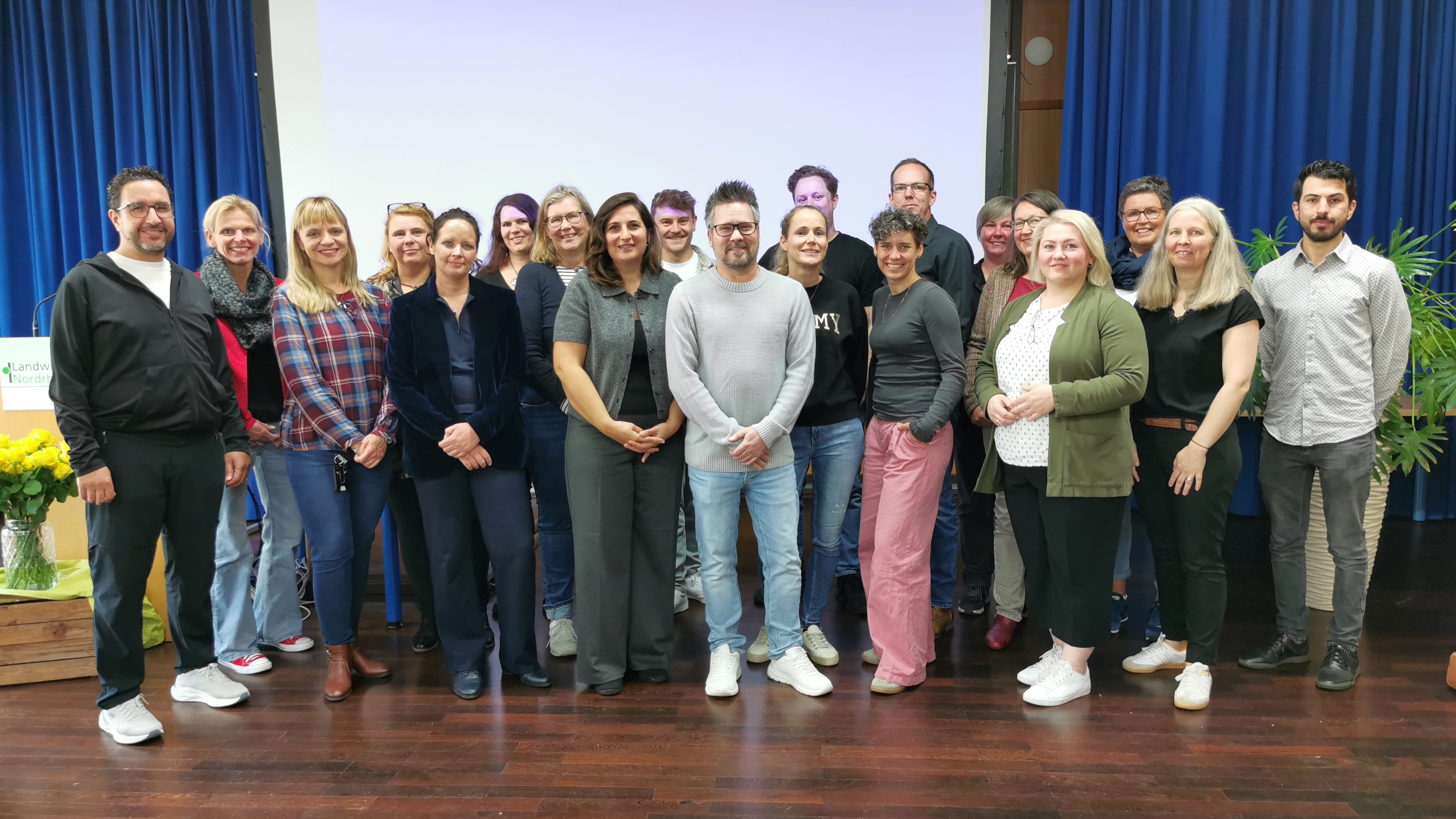 von links: Rachid Oulfil und Saskia Elders (KIM Kreis Kleve), Melanie Schwemin (Jobcenter Straelen), Nicole Berson (SOS Kinderdorf), Saskia Croonenbroeck (Gemeinde Weeze), Patricia Welling (Jobcenter Kreis Kleve), Katja Doedter (BBZ Geldern), Aygül Nokta (KIM Kreis Kleve), Julien Piron (Niederrheinische IHK), Thorsten Stern und Natascha Meurs (Jugendberufsagentur Stadt Kevelaer), Fabian Fengler (Gemeinde Kerken), Michal Kramer (Niederrheinische IHK), Marcus Trappe (Agrobusiness Niederrhein), Meike Mevißen (Berufskolleg Geldern), Anne van Rennings (Lei.la e.V.), Valentina Janzen und Gudrun Blumenkemper (Caritas-Verband), Steffi Hammel (Kreissportbund) und Aree Sadoon (KIM Kreis Kleve) Foto: Agrobusiness Niederrhein