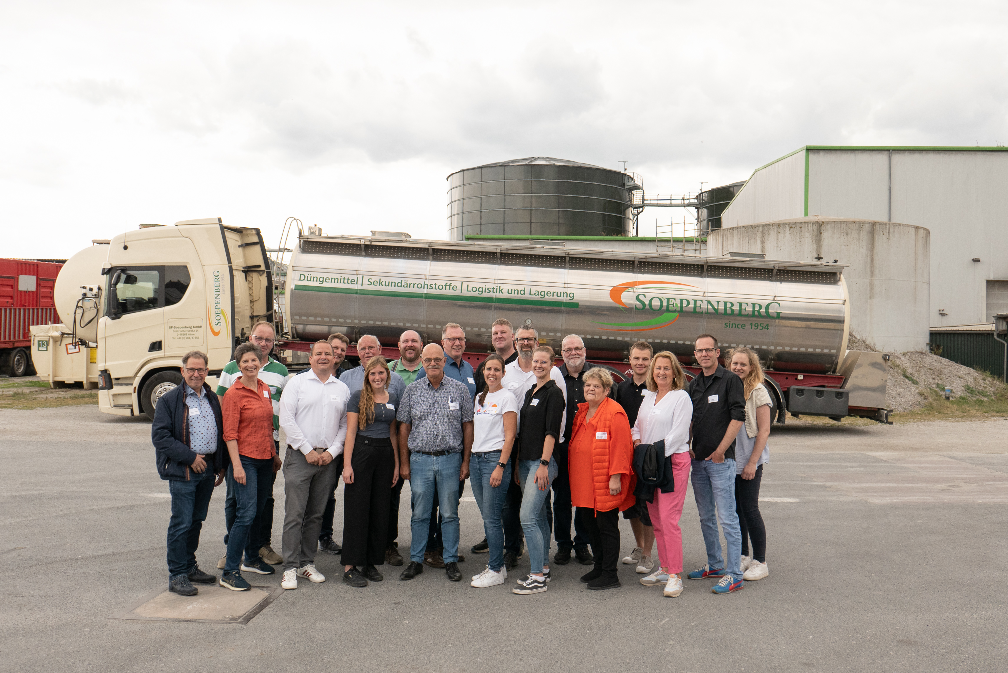 Die Besuchergruppe von Agrobusiness Niederrhein mit einem Tankauflieger im Hintergrund.
