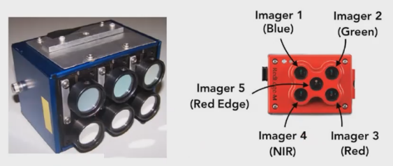 Kameras sind Sensoren, die Licht „messen“. RGB Kameras messen im Bereich der roten, grünen und blauen Farben. Die sogenannten NIR-Infrared Kameras wiederum messen Lichtwellenlängen im nahen Infrarotberiech. Diese beiden Kameratypen gibt es auch in einem Gehäuse und die entstehende Kamera nennt sich Multispektralkamera. Die Multispektralkamera kann damit Licht mit einer deutlich größeren Bandbreite von Wellenlängen erfassen, die sich von denen des sichtbaren bis zu denen des nahen infraroten Bereichs erstreckt. Einige dieser Kameras werden bereits genutzt, um das Wachstumsstadium und mögliche Erkrankungen von Nutzpflanzen zu ermitteln. Von diesen Kameras gibt es mittlerweile auch eine Form, die im Grunde aus mehreren Kameras besteht, die ihre eigenen Linsen besitzen und nebeneinander verbaut sind. Solche „Multilinsen-Kameras“ werden jedoch meist nur in der Forschung genutzt. Einfacher auf der Abbildung unten zu erkennen[SA1] :