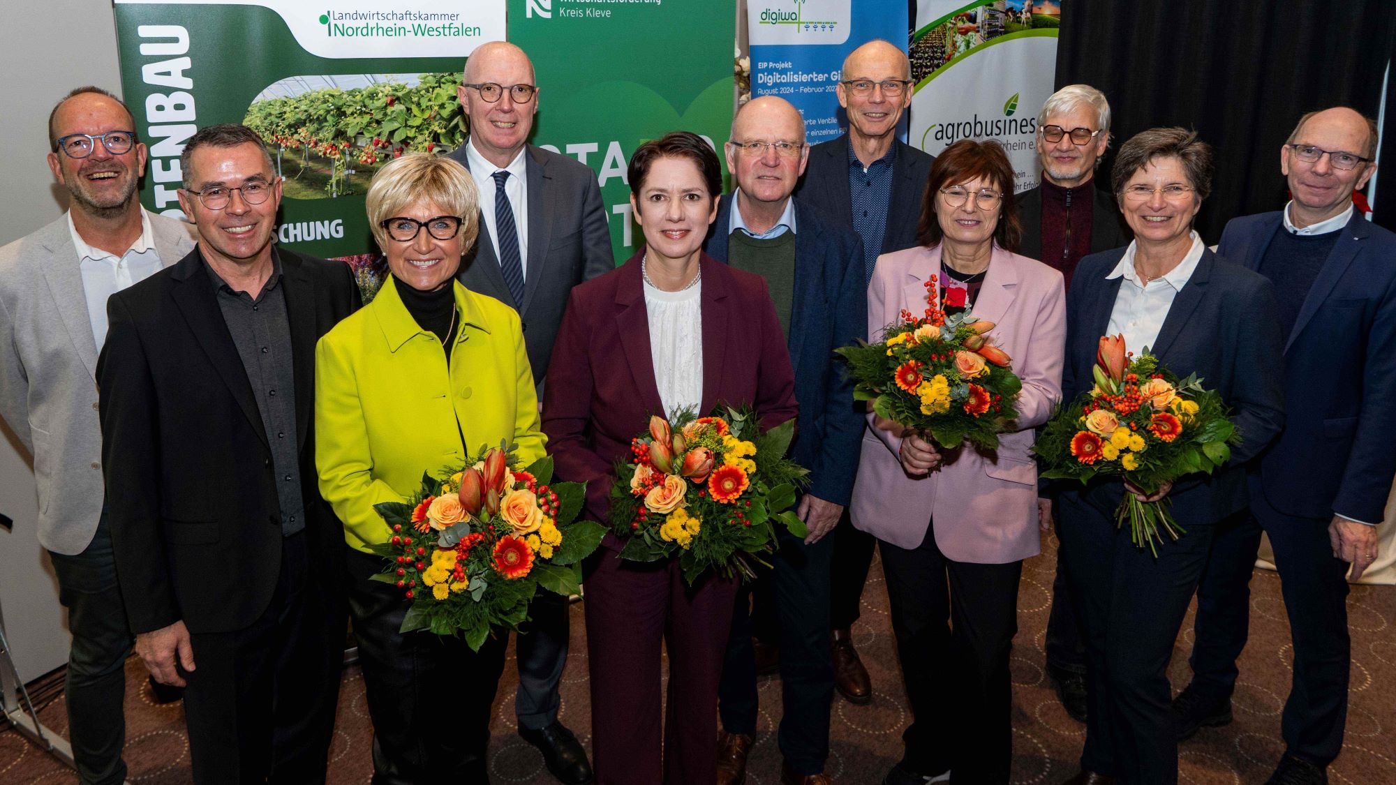 von links: John van Helden (Yookr), Peter Tiede-Arlt (Landwirtschaftskammer NRW), Eva Kähler-Theuerkauf (Präsidentin des Zentralverbandes Gartenbau e.V.), Christoph Gerwers (Landrat des Kreises Kleve), Silke Gorißen (Ministerin für Landwirtschaft und Verbraucherschutz NRW), Karl Werring (Präsident der Landwirtschaftskammer NRW), Andrew Gallik (Landwirtschaftskammer NRW), Brigitte Jansen (Geschäftsführerin der Wirtschaftsförderung des Kreis Kleve), Prof. Thomas Rath (Hochschule Osnabrück), Dr. Anke Schirocki (Agrobusiness Niederrhein e.V.), Markus Baumgärtner (Landwirtschaftskammer NRW)