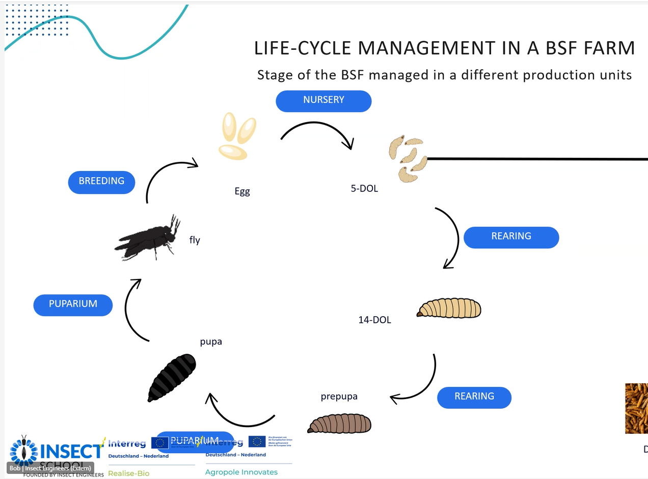 Bob Holtermans van InsectEngineers & InsectSchool presenteerde de veelzijdige toepassingsmogelijkheden van de zwarte soldatenvlieg. Naast de ontwikkelingsstadia, -tijden en de producten die uit insecten worden gewonnen (eiwitmeel, olie en frass), ging hij in op de potentie van insecten als voer. Deze insectensoort kan vrijwel met alles worden gevoerd en is in staat afvalstromen om te zetten in waardevol eiwit en frass. Daarbij werd duidelijk dat vooral regelgeving in Europa het gebruik van veel geschikte voedselresten als diervoeder beperkt. InsectEngineers is wereldwijd actief in projecten, onder andere in Kenia, Chili, Engeland, Abu Dhabi, Turkije, Spanje en de Verenigde Staten, en test verschillende voervarianten voor een efficiënte insectenproductie.